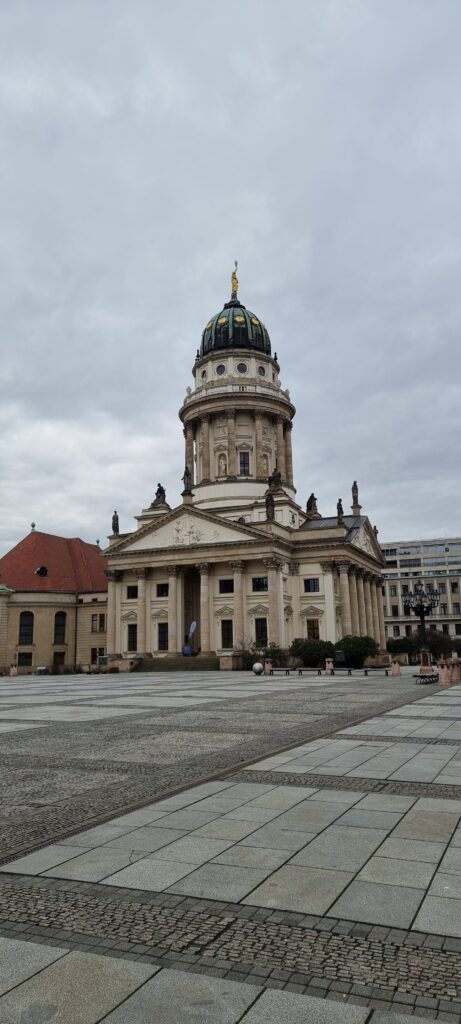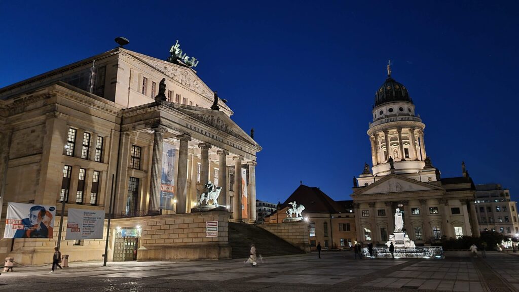 Le Gendarmenmarkt est souvent considérée comme l’une des plus belles places de Berlin. Située dans le quartier de Mitte, elle séduit par son élégance et son harmonie architecturale. La place est encadrée par trois édifices majeurs : la Cathédrale française (Französischer Dom), la Cathédrale allemande (Deutscher Dom) et la Konzerthaus, une salle de concert prestigieuse qui trône en son centre.