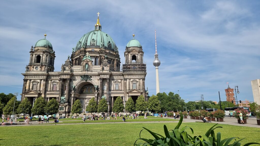 La Cathédrale de Berlin (Berliner Dom) est l’un des édifices religieux les plus impressionnants de la capitale allemande. Située sur l’Île aux Musées, dans le quartier de Mitte, elle se distingue par son architecture monumentale de style néo-baroque et par sa majestueuse coupole verte, visible de loin. Construite au début du XXᵉ siècle, la cathédrale était destinée à représenter la puissance de l’Église protestante et de l’Empire allemand.