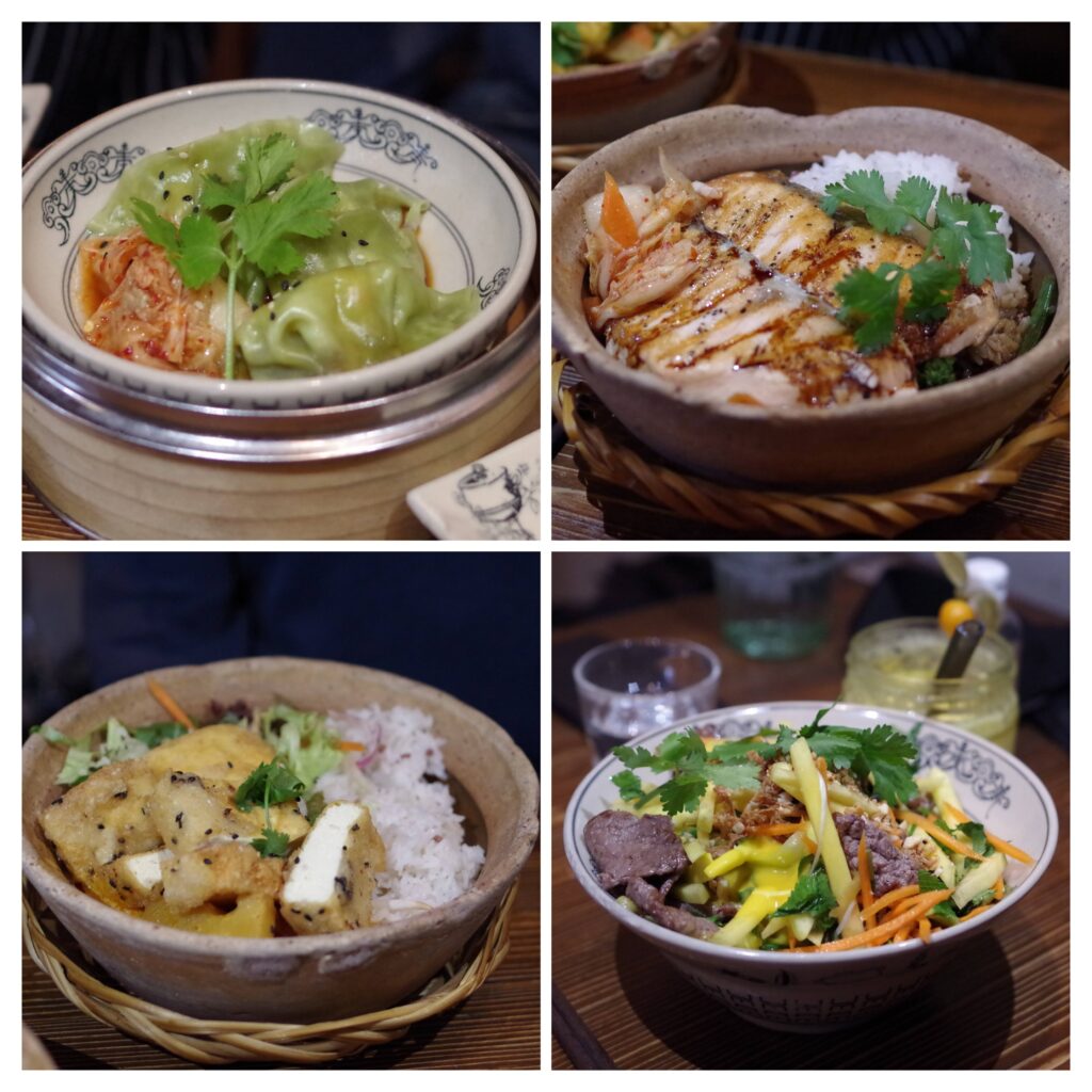 On y savoure de délicieux bols de nouilles fumants enrichis de légumes, herbes et choix de viande ou tofu, ainsi que une variété de plats comme des bao buns, currys, salades et dumplings, avec des options végétariennes et végétaliennes disponible.