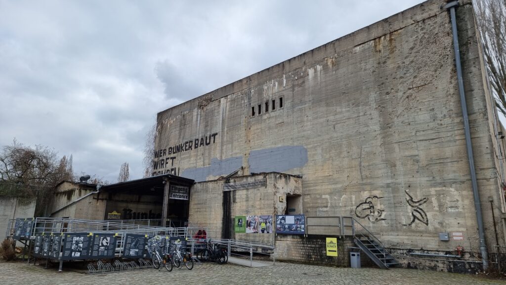 Ce lieu est le Berlin Story Bunker, un ancien bunker antiaérien de la Seconde Guerre mondiale situé à Berlin, non loin d’Anhalter Bahnhof. Construit en 1942, ce bunker massif en béton armé faisait partie du système de défense civile destiné à protéger la population et les infrastructures des bombardements alliés. Son architecture brute, aux murs extrêmement épais et presque sans ouvertures, témoigne de la logique militaire et de la peur permanente qui régnaient à Berlin à cette époque.