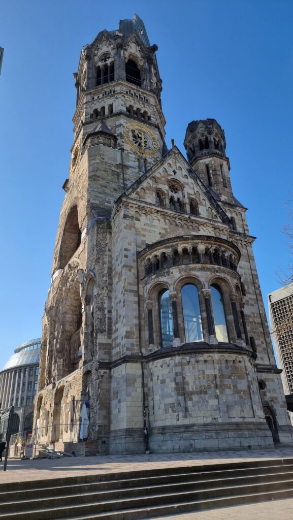 À côté de cette ruine se dresse une église moderne, conçue dans les années 1960, reconnaissable à ses murs de verre bleu qui créent une atmosphère à la fois apaisante et solennelle. L’ensemble architectural incarne le contraste entre mémoire et renouveau, faisant de l’église un lieu de recueillement mais aussi un symbole puissant de la résilience de Berlin et de son engagement pour la paix.