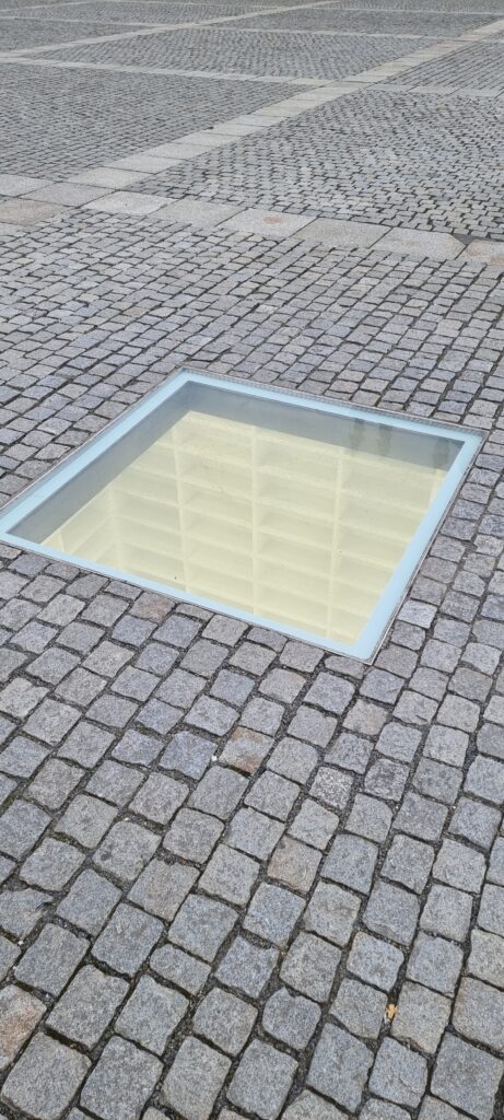 Pour commémorer cet événement sombre, la place abrite une œuvre d’art saisissante nommée « Bibliothèque vide » (ou Die leere Bibliothek), créée par l’artiste israélien Micha Ullman. Cette installation consiste en une chambre souterraine vitrée, visible depuis la surface par une plaque de verre encastrée dans le sol, contenant des étagères vides, symbolisant la perte et la destruction de la culture, de la connaissance et de la liberté d’expression.
