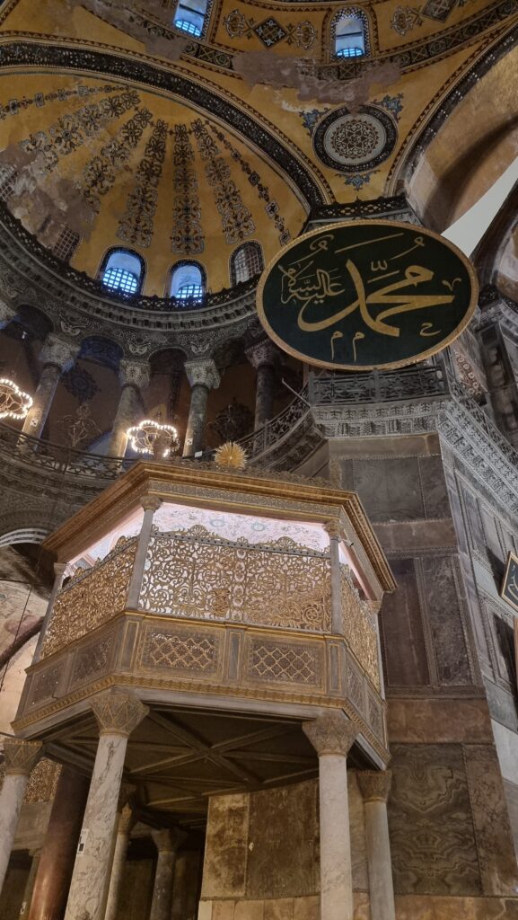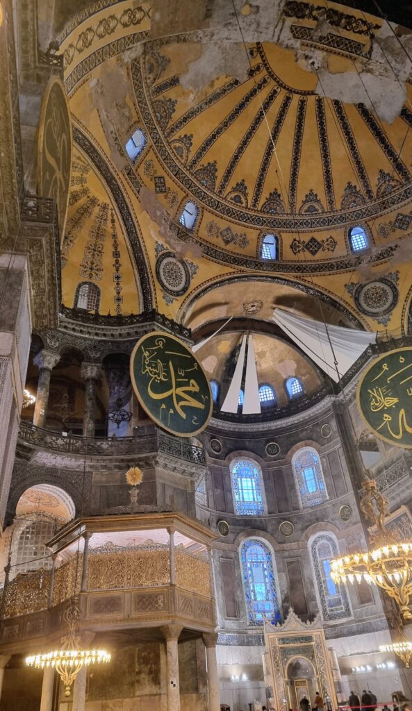 Construite au VIᵉ siècle sous l’empereur byzantin Justinien, Sainte-Sophie fut d’abord une basilique chrétienne, avant de devenir mosquée à l’époque ottomane, puis musée au XXᵉ siècle, et aujourd’hui de nouveau mosquée. Cette succession de fonctions explique la richesse unique du lieu, où se côtoient mosaïques chrétiennes dorées, immenses calligraphies islamiques et une architecture révolutionnaire pour son époque. À l’intérieur, le regard est immédiatement attiré par l’immense coupole, véritable prouesse technique qui semble flotter au-dessus de l’espace. Les jeux de lumière, la démesure des volumes et le silence solennel créent une atmosphère profondément émouvante. Chaque détail raconte l’histoire d’Istanbul, carrefour entre l’Orient et l’Occident, entre traditions chrétiennes et musulmanes.