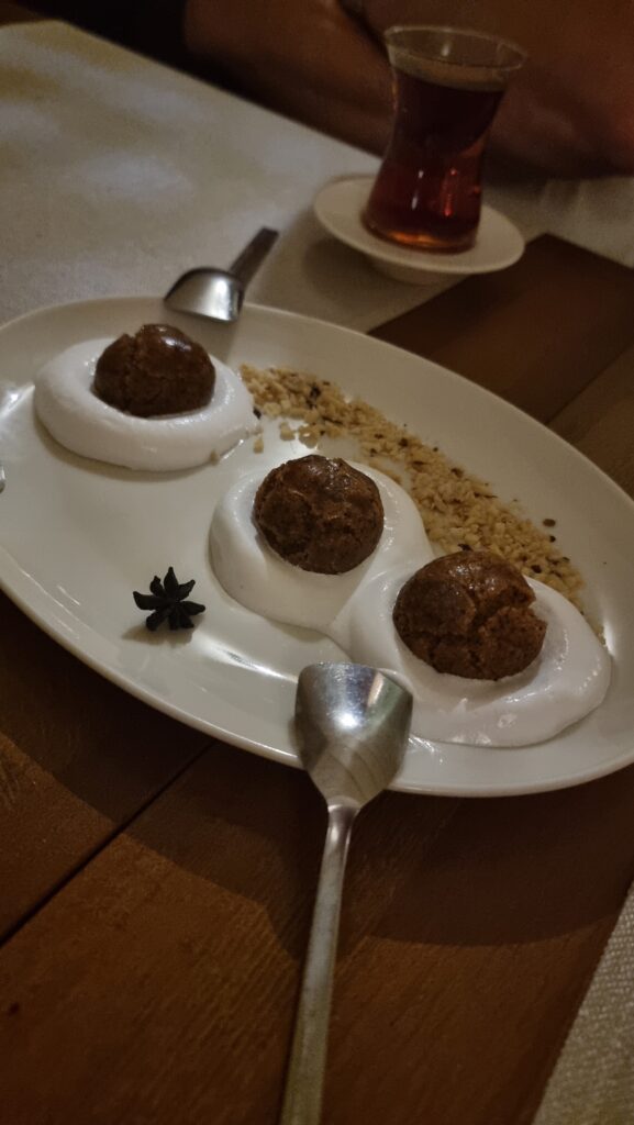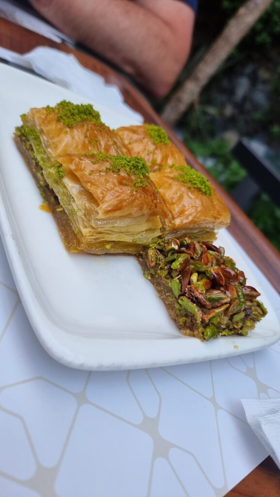 Côté plats traditionnels, j’ai été marqué par la diversité des textures et des épices, toujours parfaitement équilibrées. Les pide, surnommées “pizzas turques”, les köfte fondantes ou encore les plats mijotés comme le güveç révèlent un profond respect du produit. Et que dire des desserts turcs ? Le baklava croustillant, le künefe au fromage filant ou les loukoums parfumés à la rose sont de véritables plaisirs gourmands.