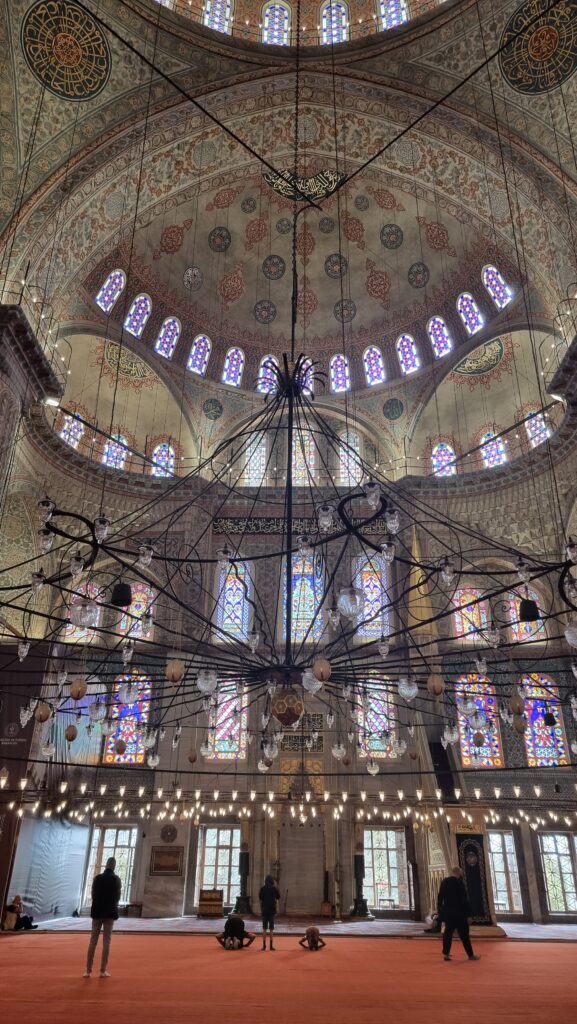 À l’intérieur, la Mosquée Bleue émerveille par ses plus de 20 000 carreaux de faïence d’Iznik, aux motifs floraux délicats et aux nuances de bleu qui lui ont valu son surnom. La lumière naturelle, filtrée par plus de 200 vitraux, crée une atmosphère paisible et presque magique, invitant à la contemplation. Entre prouesse architecturale et lieu de culte toujours actif, la Mosquée Bleue incarne à merveille l’âme spirituelle et artistique d’Istanbul.