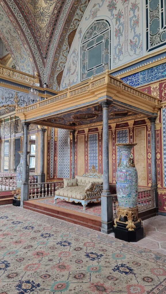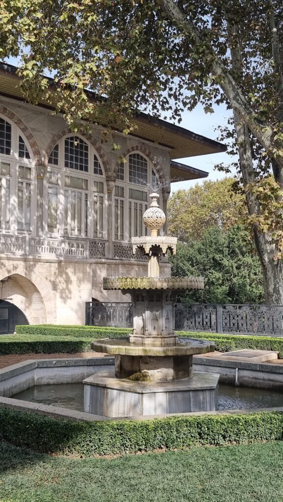 Dès l’entrée, on comprend que Topkapı n’est pas un simple palais, mais une véritable ville dans la ville. Organisé autour de plusieurs cours successives, il révèle peu à peu ses trésors : pavillons richement décorés, jardins paisibles, salles d’audience et bibliothèques. Chaque espace raconte la vie quotidienne de la cour ottomane, entre pouvoir, cérémonial et intimité.