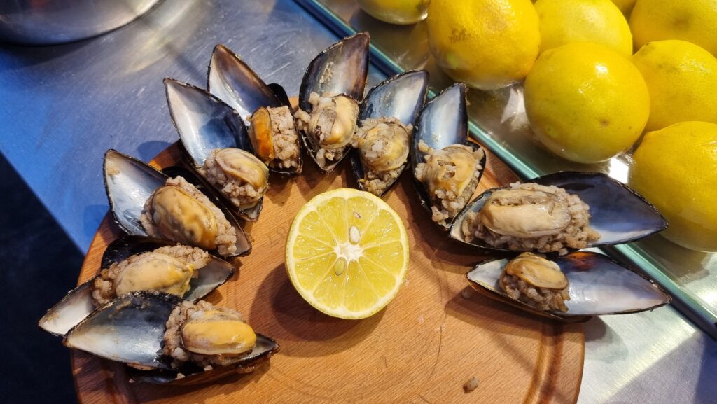 Les moules farcies au riz (« midye dolma ») sont un incontournable de la street food d’Istanbul et un vrai délice à goûter absolument lors de ton séjour à Istanbul. Il s’agit de moules fraîches dont les coquilles sont garnies d’un mélange savoureux de riz, d’herbes fraîches (comme le persil), d’épices, parfois d’oignons et de pignons de pin. Ce mélange est cuit à la vapeur directement dans la coquille, ce qui permet au riz de s’imprégner de toutes les saveurs de la mer et des aromates 🤤.