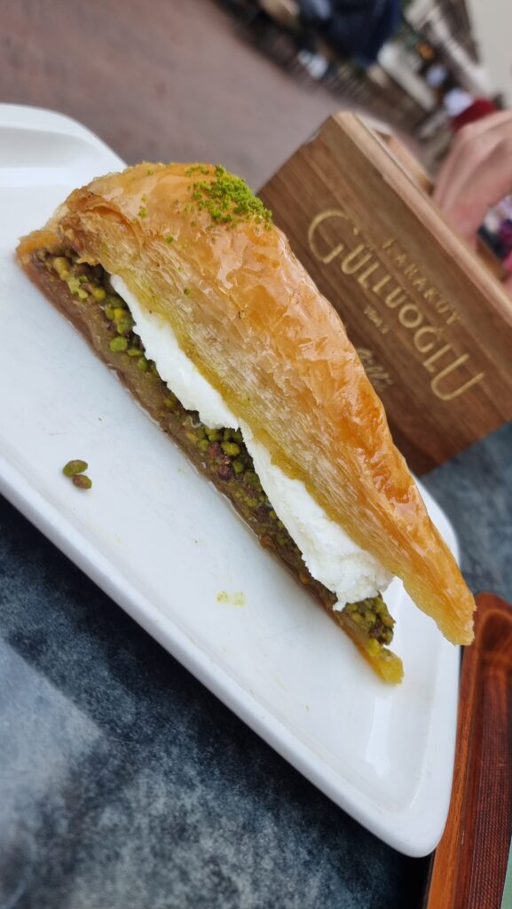 Ce qui fait la renommée de Karaköy Güllüoğlu, c’est l’équilibre parfait entre le croustillant de la pâte filo, le fondant de la garniture et la juste dose de sirop, jamais écœurante. Chaque bouchée est riche, précise, maîtrisée. Le baklava y est servi frais, souvent accompagné d’un verre de thé turc, pour contrebalancer la douceur.